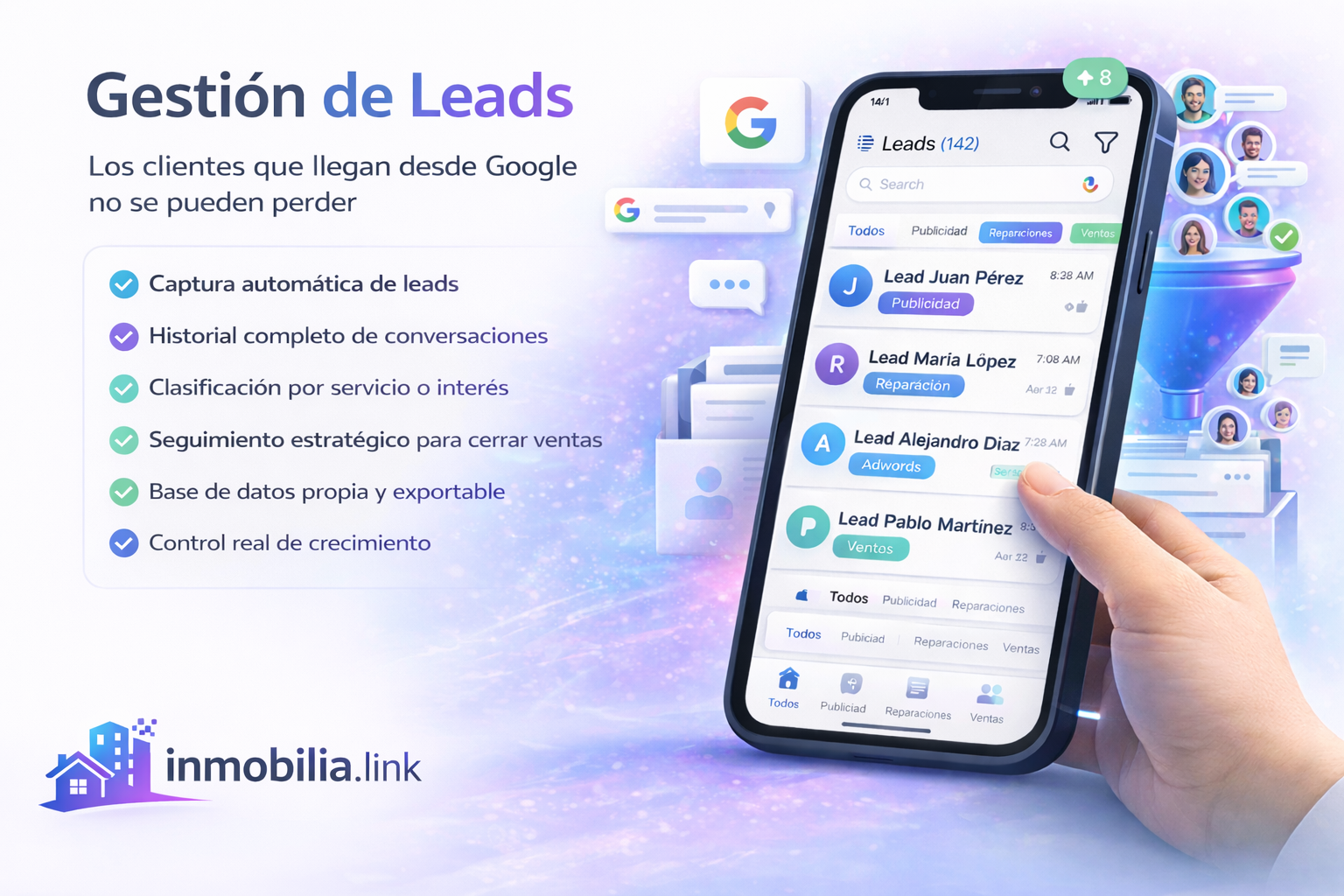 No importa desde dónde te contacten. Cada prospecto se almacena en tu base de datos privada, creando un activo propio que puedes organizar, segmentar y utilizar para cerrar más ventas o alquileres.