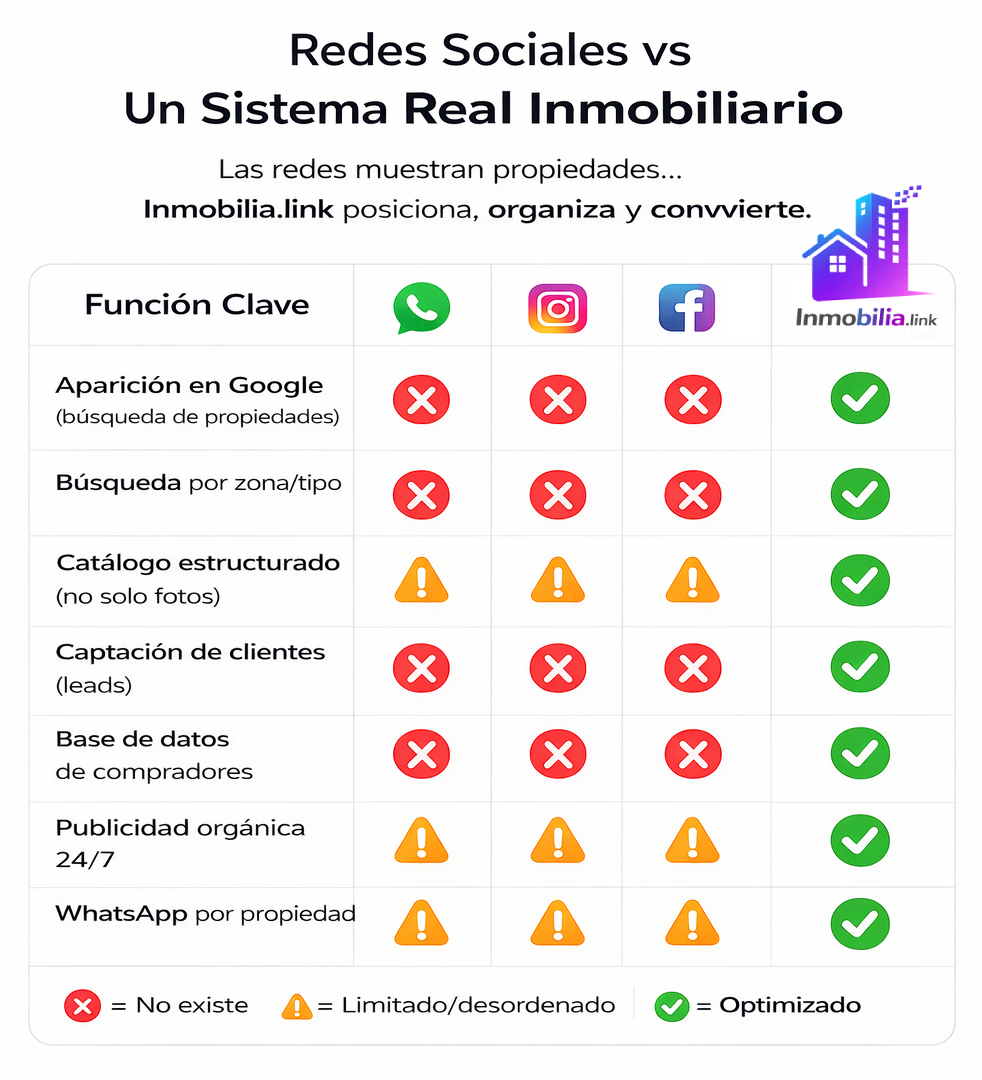 Ver comparación completaMientras otros pagan anuncios constantemente, tu catálogo inmobiliario trabaja 24/7 atrayendo clientes.